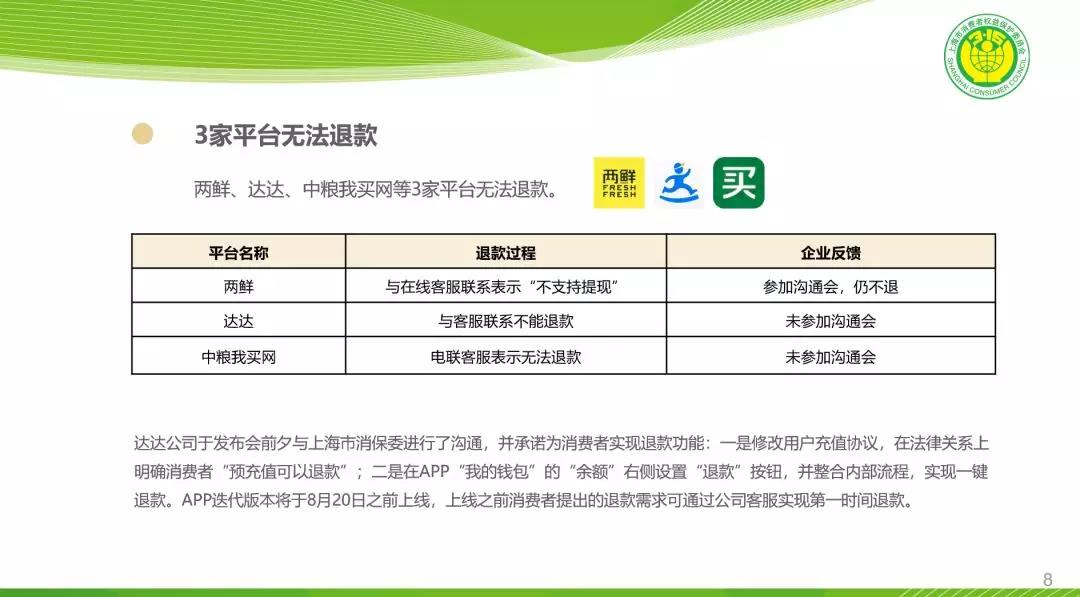 此外,31家网络平台中,来伊份退款需要手续费,两鲜、达达、中粮我买网3家不能退款。