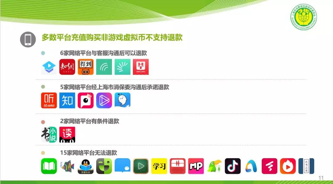 为了解网络平台充值和退款现状,促进网络消费健康发展,上海市消保委在今年1月份开展了为期4个月的充值消费体察。面向31家网络平台和28家以购买非游戏类虚拟币形式充值的网络平台,通过模拟普通消费者对平台进行充值和提现。体察发现,31家网络平台中有27家在平台可以自行退款。